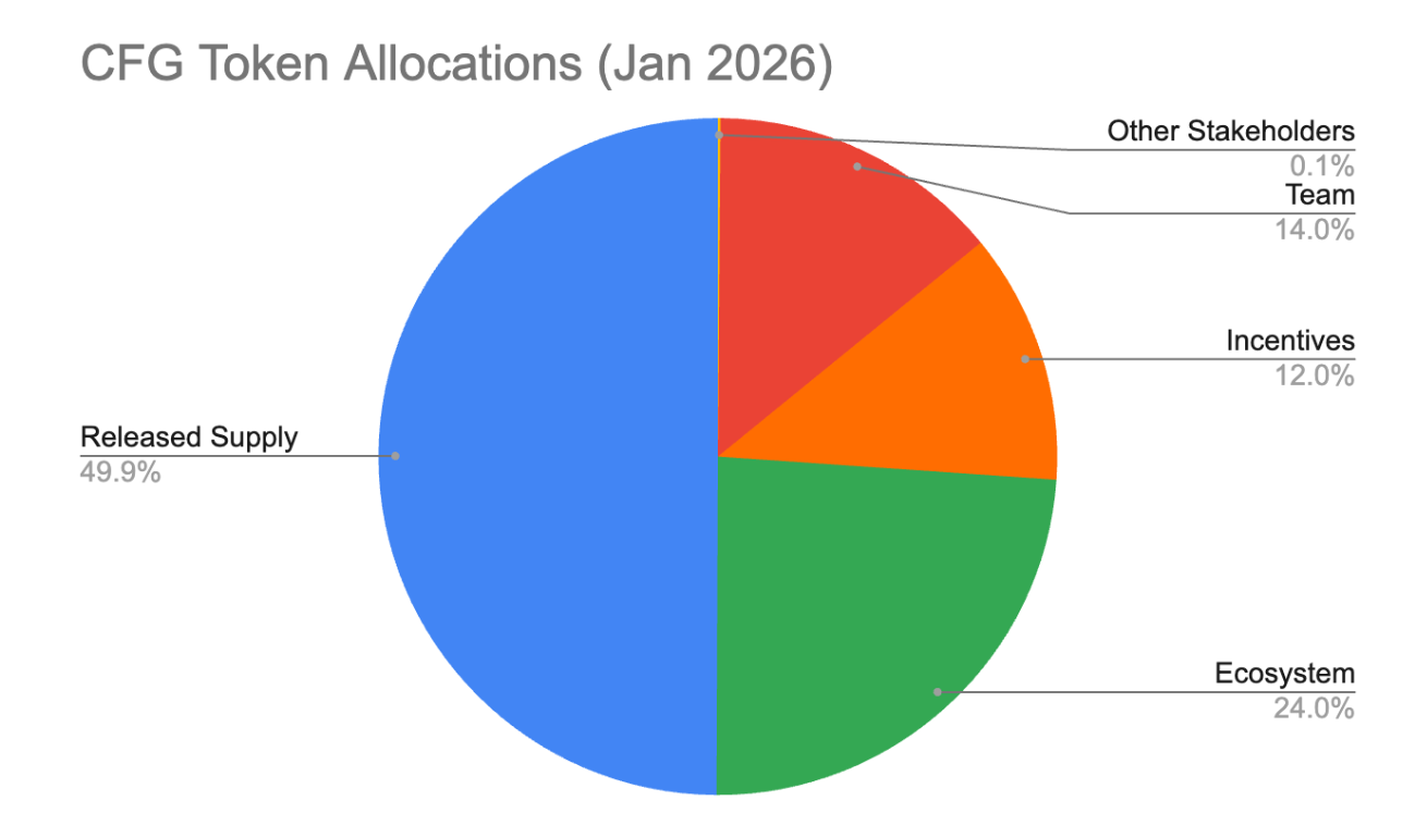 50% of the CFG supply is considered “released” as of January 2026; these tokens are freely circulating and exclude the specific allocations mentioned above for team, incentives, ecosystem and other stakeholders.